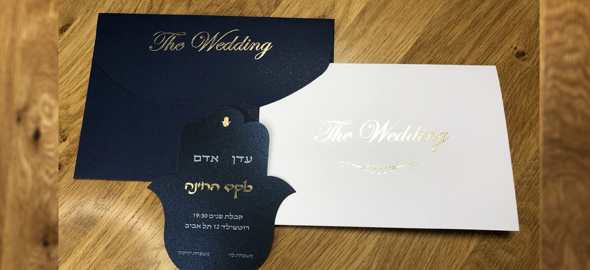 הזמנה נפתחת נייר מיוחד גודל A5. מעטפת שטנץ בעבודת יד, נייר שחור מנצנץ עם הטבעה בזהב. הזמנה חינה חיתוך צורני בנייר תואם והטבעה יוקרתית