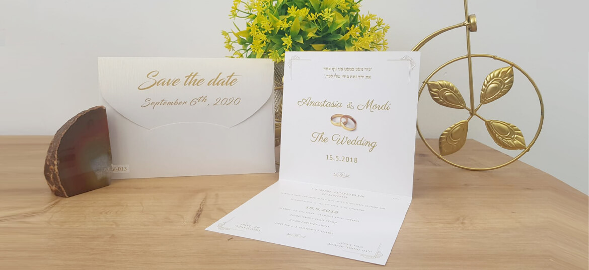 הזמנה יוקרתית נפתחת בעיצוב אלגנטי עם עיטורי פויל בצבעי זהב וכסף מודפס בהדפסה דיגיטלית איכותית.
