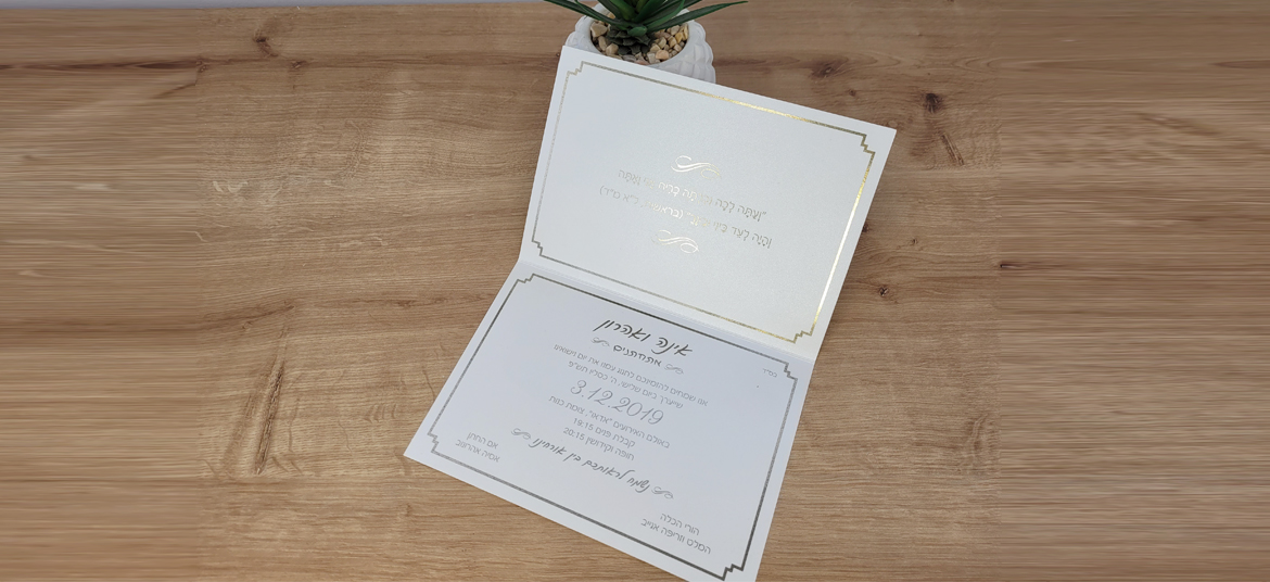 הזמנה יוקרתית נפתחת בעיצוב אלגנטי עם עיטורי פויל בצבעי זהב וכסף מודפס בהדפסה דיגיטלית איכותית.