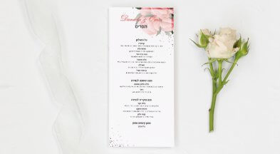 |הזמנה פרחונית בגווני ורוד ואדום עם רקע מנוקד וכיתוב בתוך מרובע חלבי ומרובע שחור במראה אלגנטי.