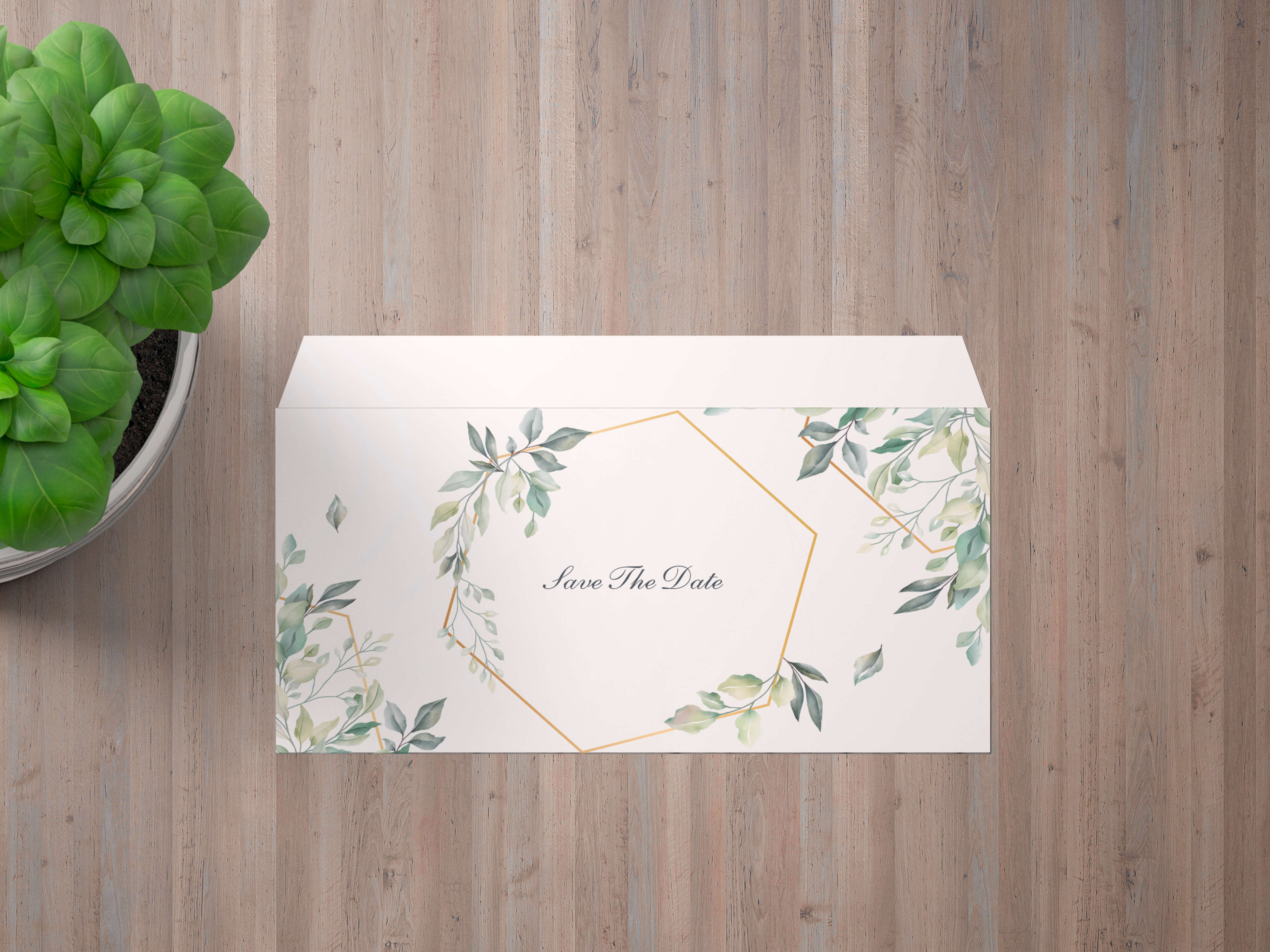 |הזמנה מודפסת על גבי נייר כרומו 300 גרם בעיצוב של עלים ומשושה גיאומטרי בצבע זהב, ניתן להוסיף פויל להדגשה יוקרתית.
