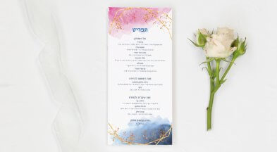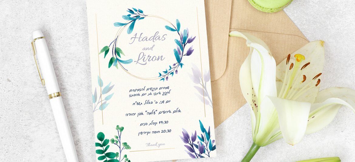 |הזמנה מודפסת על נייר 300 גרם, בעיצוב מראה של צבעי מים ושילוב צורה גיאומטרית בצבע זהב, הניתנת להחלפה בפויל זהב או כסף.