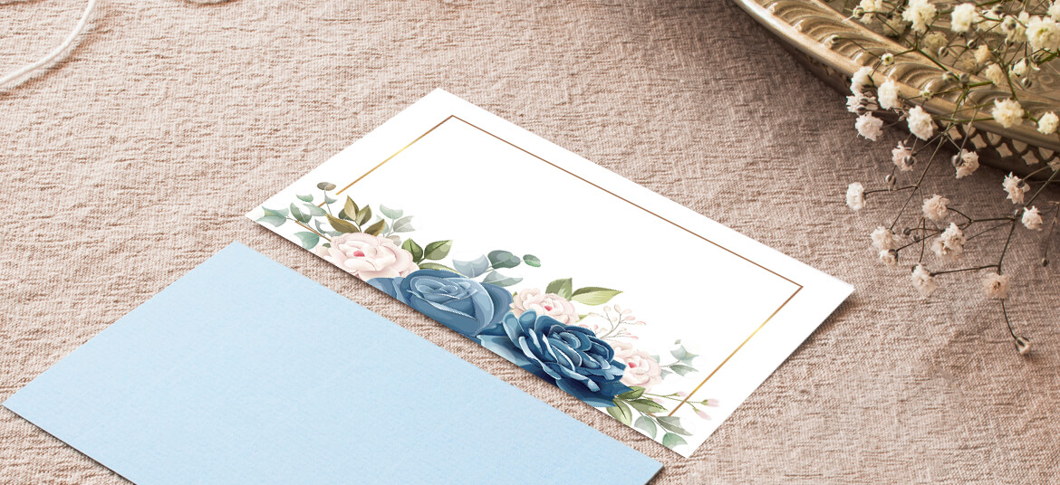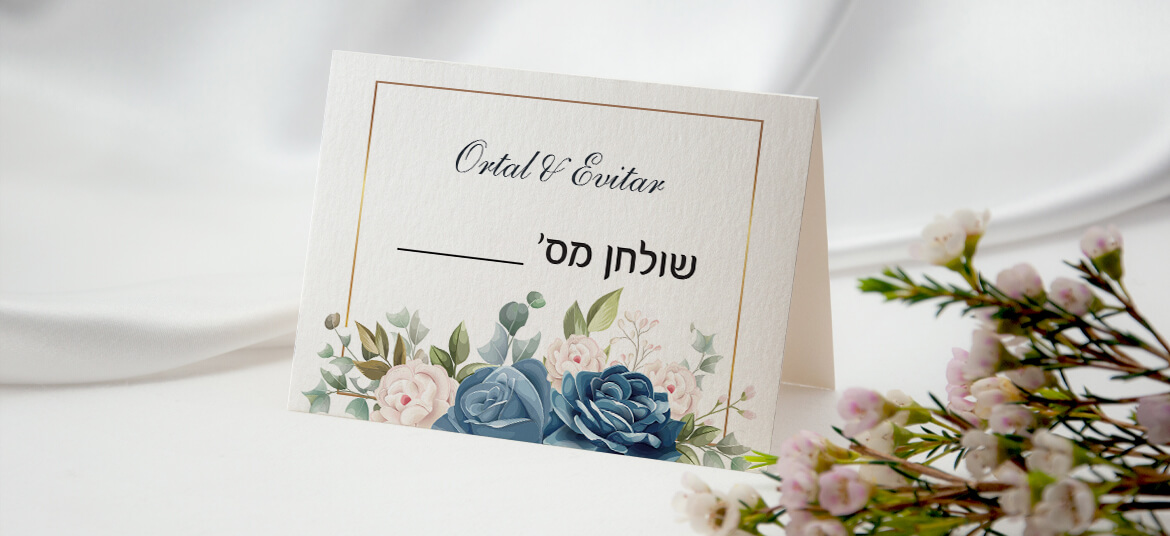 |הזמנה קלאסית מיוחדת בעיצוב של שושנים בצבעים כחול וורוד עם מסגרת פויל זהב במראה קלאסי ומיוחד.