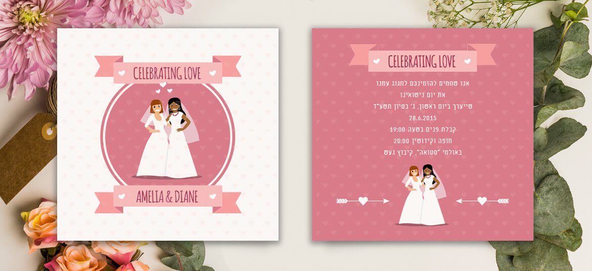 |הזמנת כלות לחתונה גאה בעיצוב ורוד ולבן על רקע של לבבות קטנים ועדינים עם איור הכלות המתחתנות.