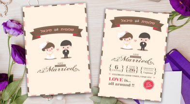 |הזמנה מאוירת ומצחיקה של זוג כלה וחתן זועף, על נייר בצבע קרם עם מסגרת בצבעים מתאימים.