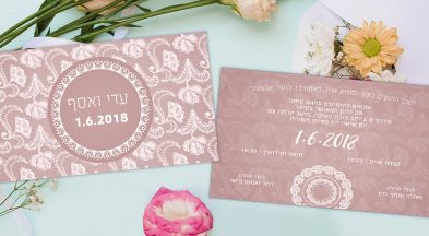 |הזמנה לחתונה בעיצוב אלגנטי של תחרה לבנה "מובלטת" במראה על רקע ורוד וכיתוב לבן, בגב ההזמנה תחרה ורודה ברקע.