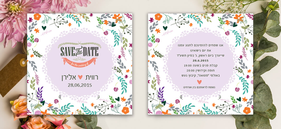 |הזמנת בוטיק מודפסת על נייר איכותי בגודל 15×15 עם עיצוב של פרחים קטנים וצבעוניים המקיפים את שם הזוג והפרטים.