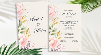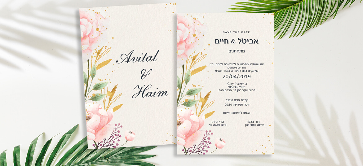 הזמנה בעיצוב רומנטי של פרחי ורדים על גבי נייר קש המקנה מראה טבעי וכפרי. ניתן להדפיס על נייר מיוחד אחר בתוספת תשלום.