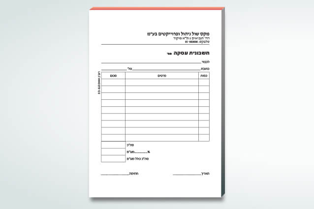 חשבונית עסקה עבור ניהול פרויקטים, פנקס בעל דף פתיחה שחור ודף העתק כימי- ניתן לשנות על פי בקשה ותוספת תשלום.