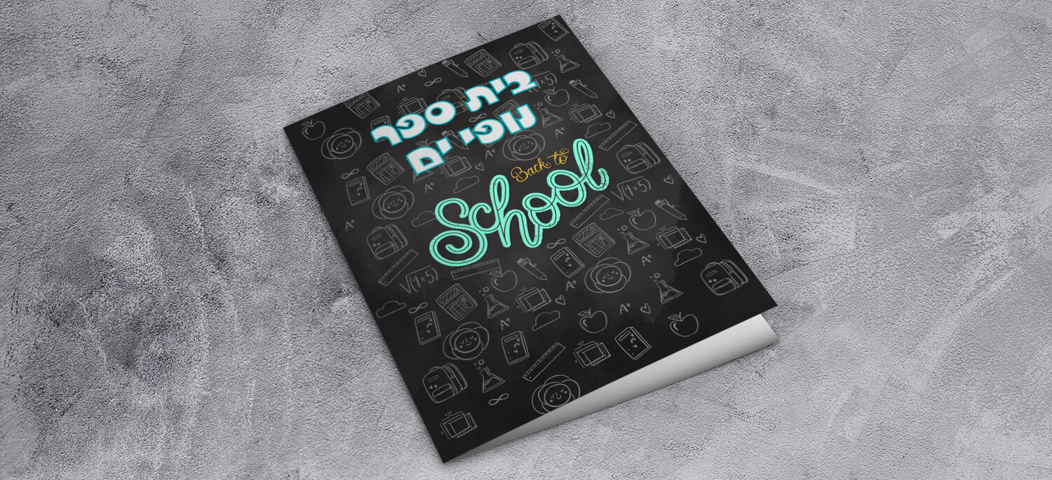 פולדר מודפס מנייר כרומו 300 גרם, בעיצוב רקע שחור עם כיתוב עבור בית ספר נופי ים עבור חזרה לספסל הלימודים.