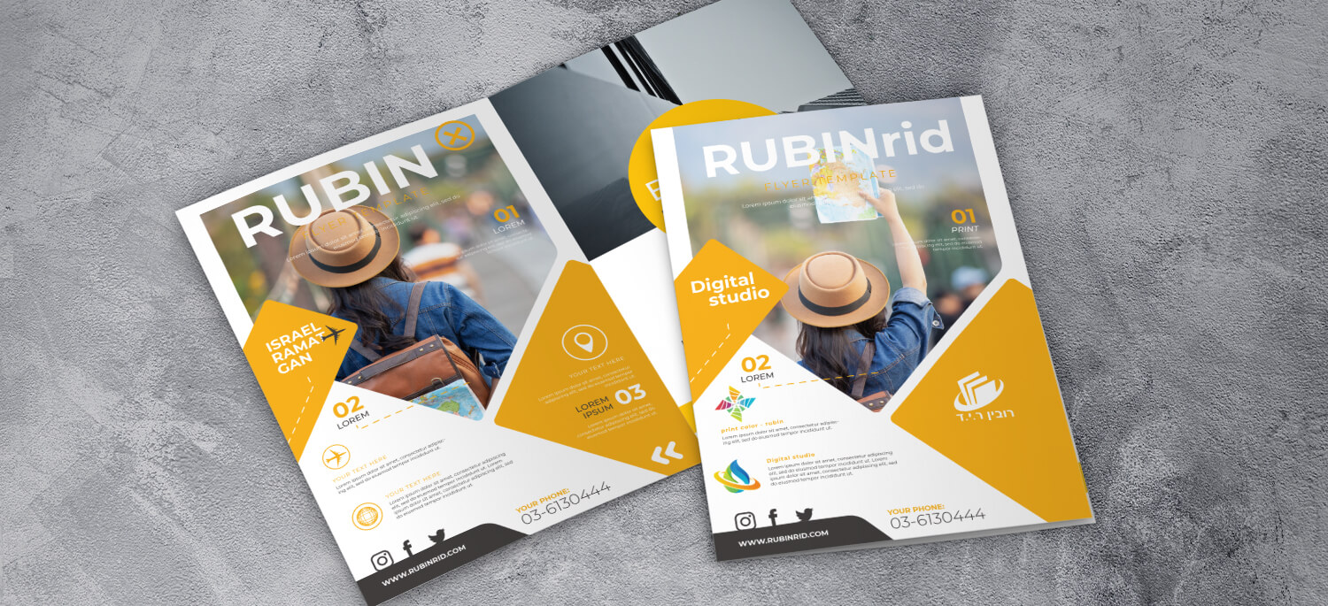 פולדר מודפס ומעוצב בחיתוך גיאומטרי כתום ולבן, ניתן להוסיף ולהוריד מלל ולוגו על פי בחירה אישית